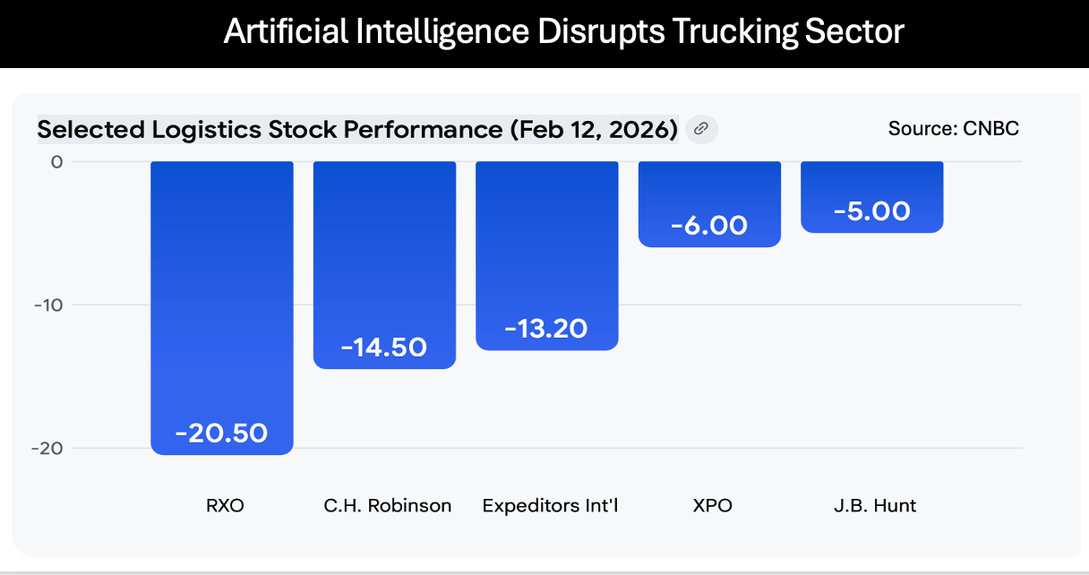 On February 12, 2026, trucking and logistics stocks suffered a sharp equity market sell-off that few had anticipated just weeks earlier. Shares of RXO, C.H. Robinson, Expeditors International, XPO, and J.B. Hunt suffered stock price losses that ranged from -5.0% to -20.5% in a single session. The catalyst was not due to higher fuel costs, labor unrest, or a recession signal. Instead, it was the unveiling of a new artificial intelligence freight-scaling platform by Algorhythm Holdings.