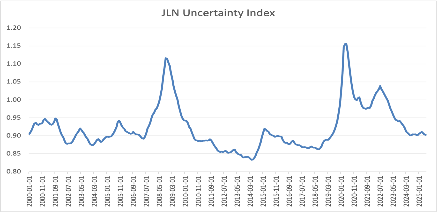 To address this breakdown, we incorporate the Jurado, Livingston, and Ng (JLN) macroeconomic Uncertainty Index, specifically the 1-year-ahead measure. This index is designed to capture one-year forward-looking uncertainty surrounding the U.S. economy by aggregating a large set of economic and financial indicators.