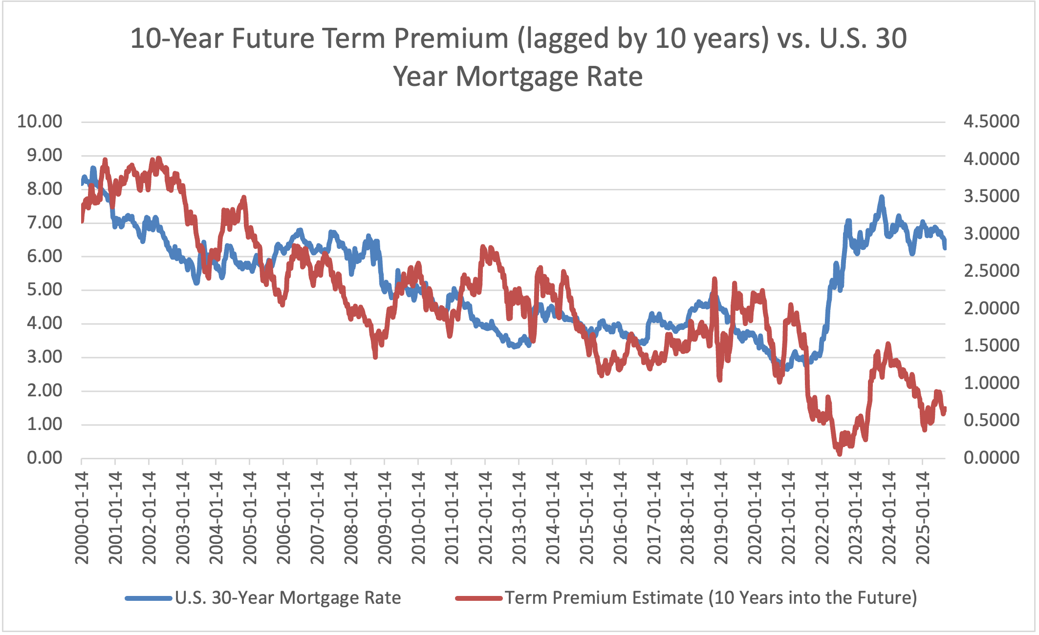This makes sense conceptually. Investors may demand additional compensation when near-term uncertainty rises, even if long-horizon expectations remain stable. That extra compensation is expressed in a higher mortgage rate relative to the lagged 10-year term premium.